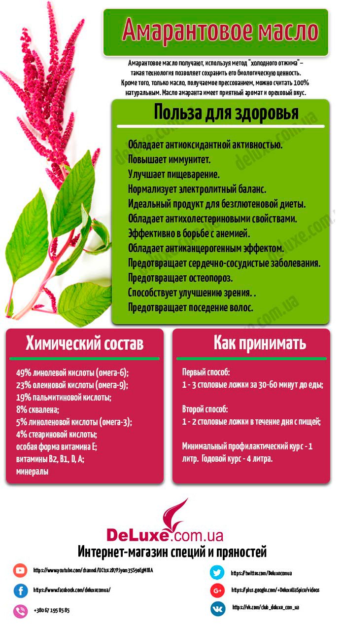Амарантове масло має багатий склад, що включає антиоксиданти, омега-3 і омега-6 жирні кислоти, а також вітаміни. Розглянемо основні переваги: