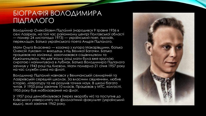 Володимир Підпалий, без перебільшення, належав до тієї категорії людей, які залишають слід. Сліди слова. Сліди мислі. Сліди душі. Його життєвий шлях — це певне поєднання ліричних мотивів, боротьби за ідеали, пошуків себе у безмежному просторі української літератури.