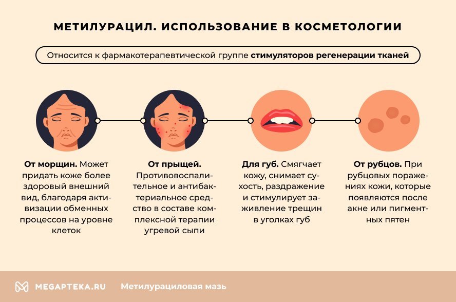 Метилурацил має здатність стимулювати регенерацію клітин. Це дозволяє ефективно використовувати його для заживлення ран, виразок і опіків. Препарат прискорює процеси клітинного ділення та утворення нових тканин, що значно скорочує період відновлення пошкоджених ділянок шкіри.