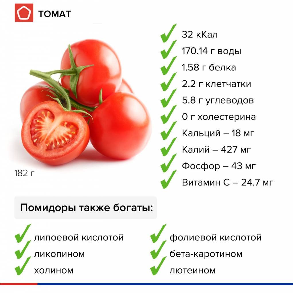 Помідори є багатим джерелом вітамінів та мінералів. Один середній помідор містить невелику кількість калорій, але забезпечує організм важливими поживними речовинами.