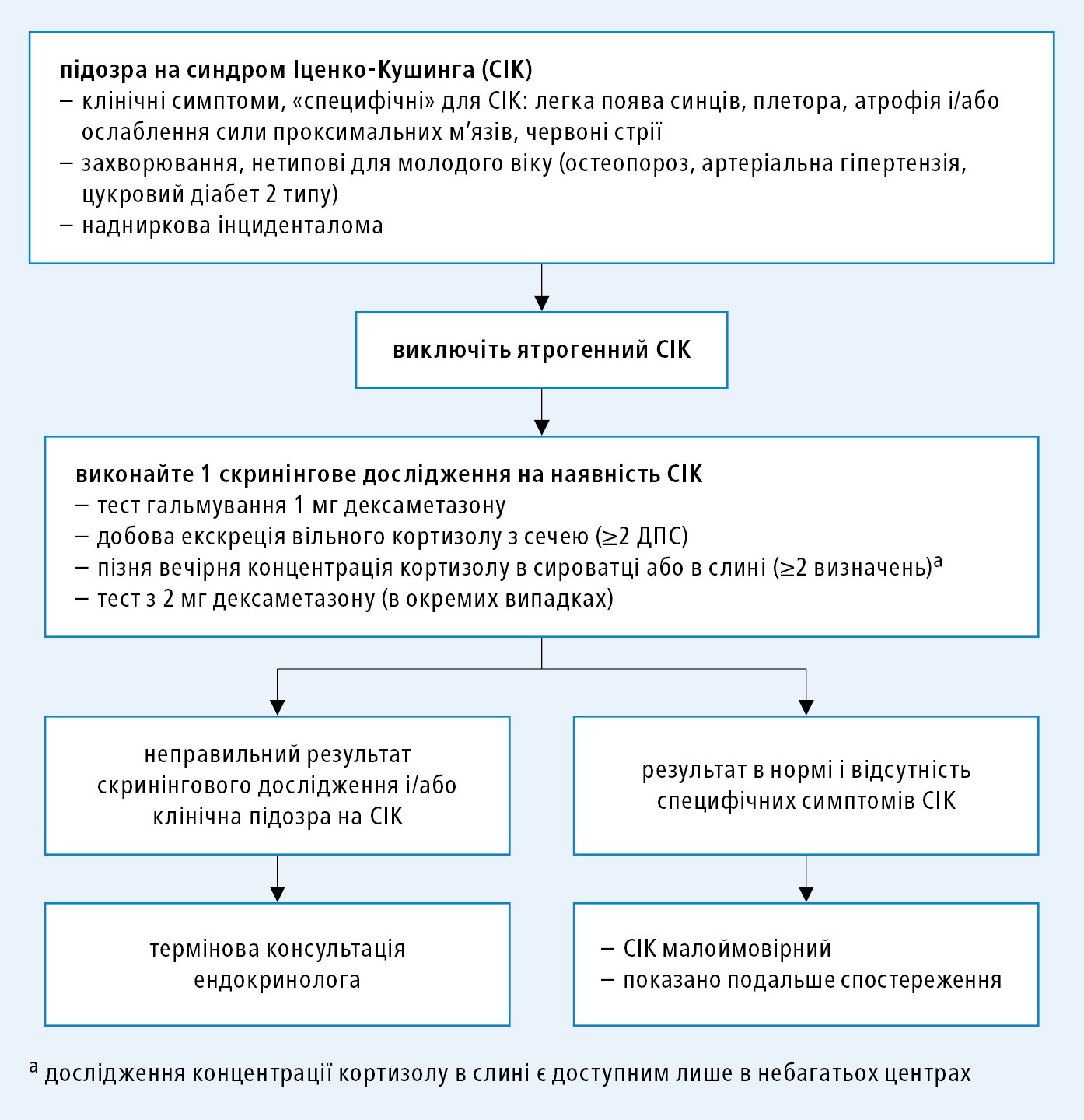 - Візуалізаційні дослідження: МРТ або КТ для виявлення аденоми гіпофізу або пухлин надниркових залоз.