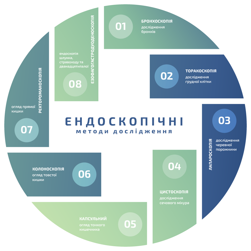- Гастроскопія — метод для дослідження стравоходу, шлунка і початкової частини тонкого кишечника. Для тих, хто має проблеми з травленням.