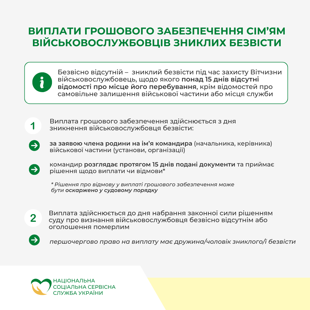 | Грошове забезпечення | Залежить від військового звання та окладу військовослужбовця | Підтвердження статуса безвісти зниклого |