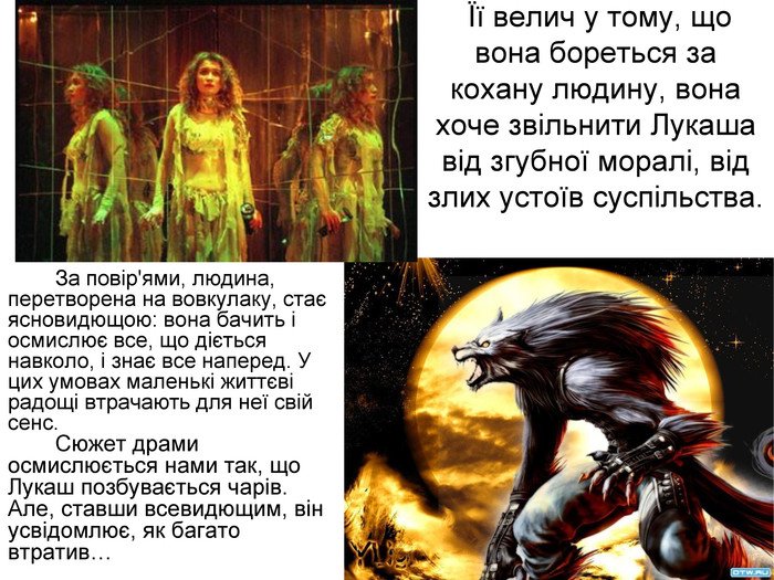 - Мавка як втілення добра. Вона любить Лукаша, але не може вплинути на його остаточний вибір, лише вказує шлях.