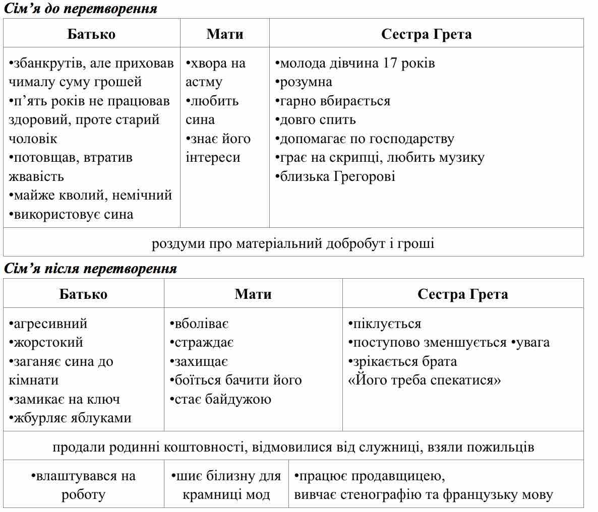 Щоб зрозуміти, хто приносив їжу Грегору і що це за собою означає, потрібно розглянути не тільки сам факт, але й поведінку членів сім’ї Грегора. Розглянемо кожного персонажа окремо: