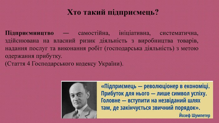 Хто ж такий підприємець? Це людина, яка прагне змінювати світ на краще шляхом інноваційної діяльності, створення робочих місць та сприяння економічному розвитку. Підприємництво є ключовим фактором у забезпеченні добробуту країни та національної самодостатності. З новітніми технологіями й зростанням глобалізації, підприємці стоять на передовій лінії змін, формуючи майбутнє соціуму. Стати підприємцем – це