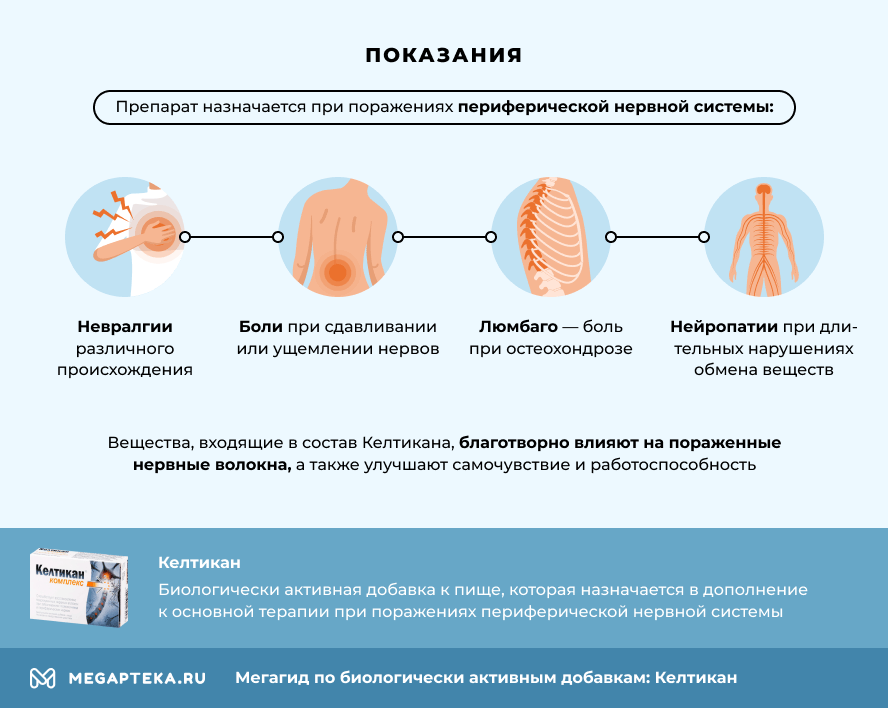 - Поліпшення функції нервової системи: Келтикан може сприяти покращенню передачі нервових імпульсів, що позитивно впливає на загальний стан нервової системи.