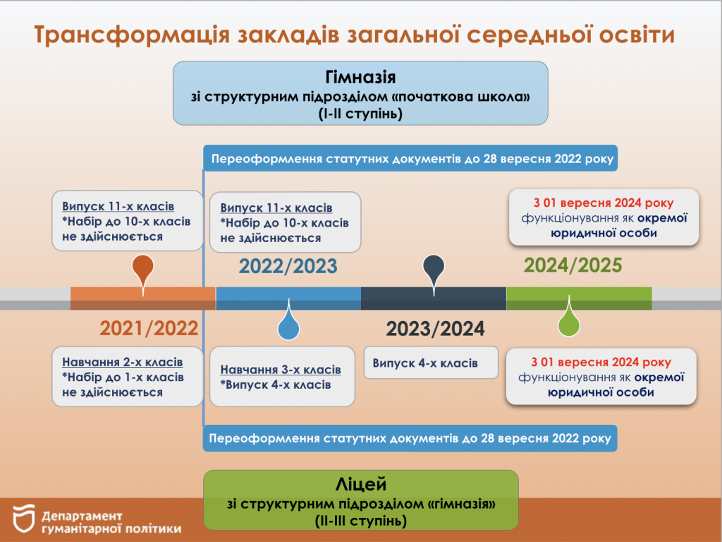 - Гімназія: У гімназії навчання триває здебільшого з 5 по 9 клас включно. Основний акцент робиться на формування базових компетентностей з можливістю поглибленого вивчення окремих предметів.