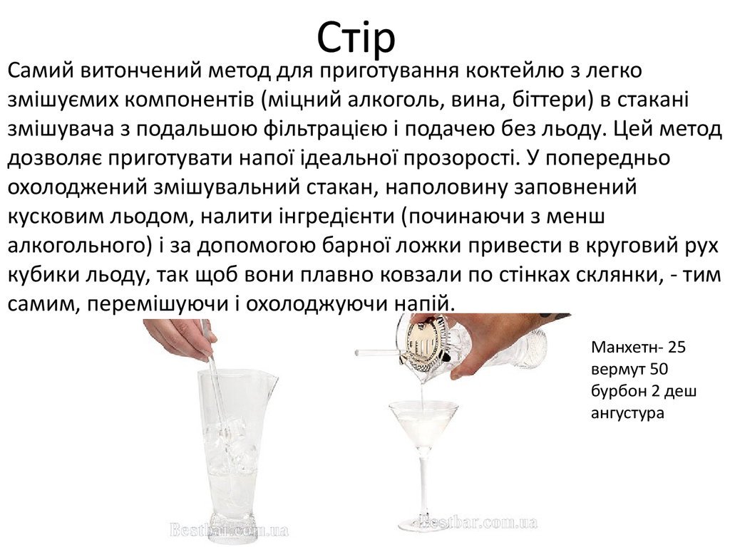 Ось тут важливий терпкий процес, де крутиться все довкола льоду і не лише. “Стірінг” – тонке мистецтво, бо тут справа не в рухах, а у всій цій ніжності. Має бути майстерність і заповзяття. Стандартний порядок: налий алкоголь у мішалку, додай інгредієнти, змішай з льодом. Розважливі рухи на додачу. В кінцевому рахунку, коктейль повинен бути охолоджений, але не розбавлений.