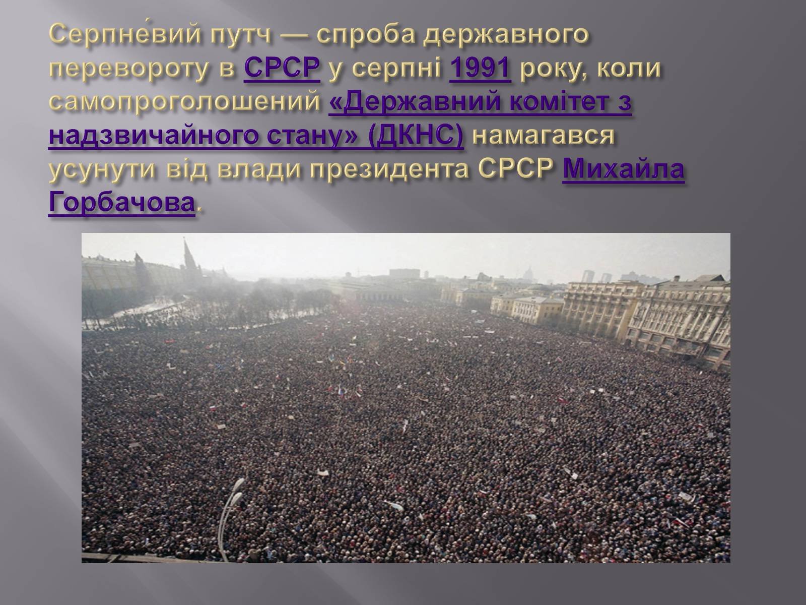 У серпні 1991 року світ став свідком спроби державного перевороту в СРСР — явища, що отримало назву «Серпневий путч». Цей заколот був організований групою членів уряду, які намагалися зберегти СРСР в умовах все ще наростаючої хвилі демократизації та національних рухів.