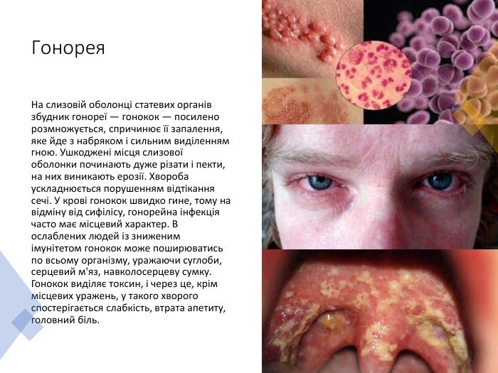 - Сифіліс: Початкові симптоми — виразки, серйозніші — можуть загрожувати життю.