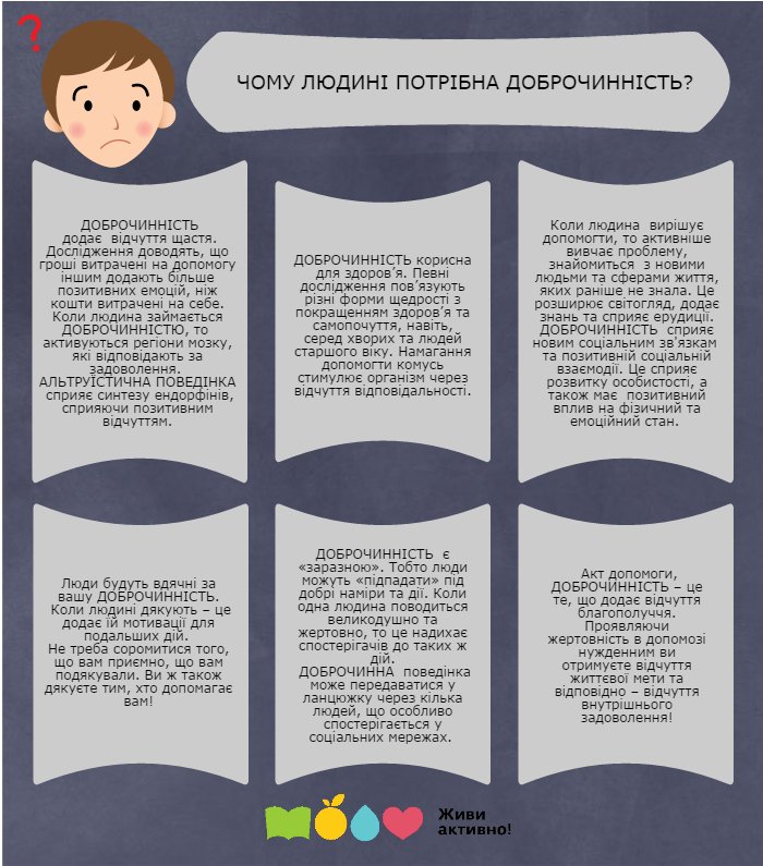 - Особиста користь: Самоактуалізація, розвиток навичок та контактів можуть стати поштовхом для участі у доброчинних проектах.