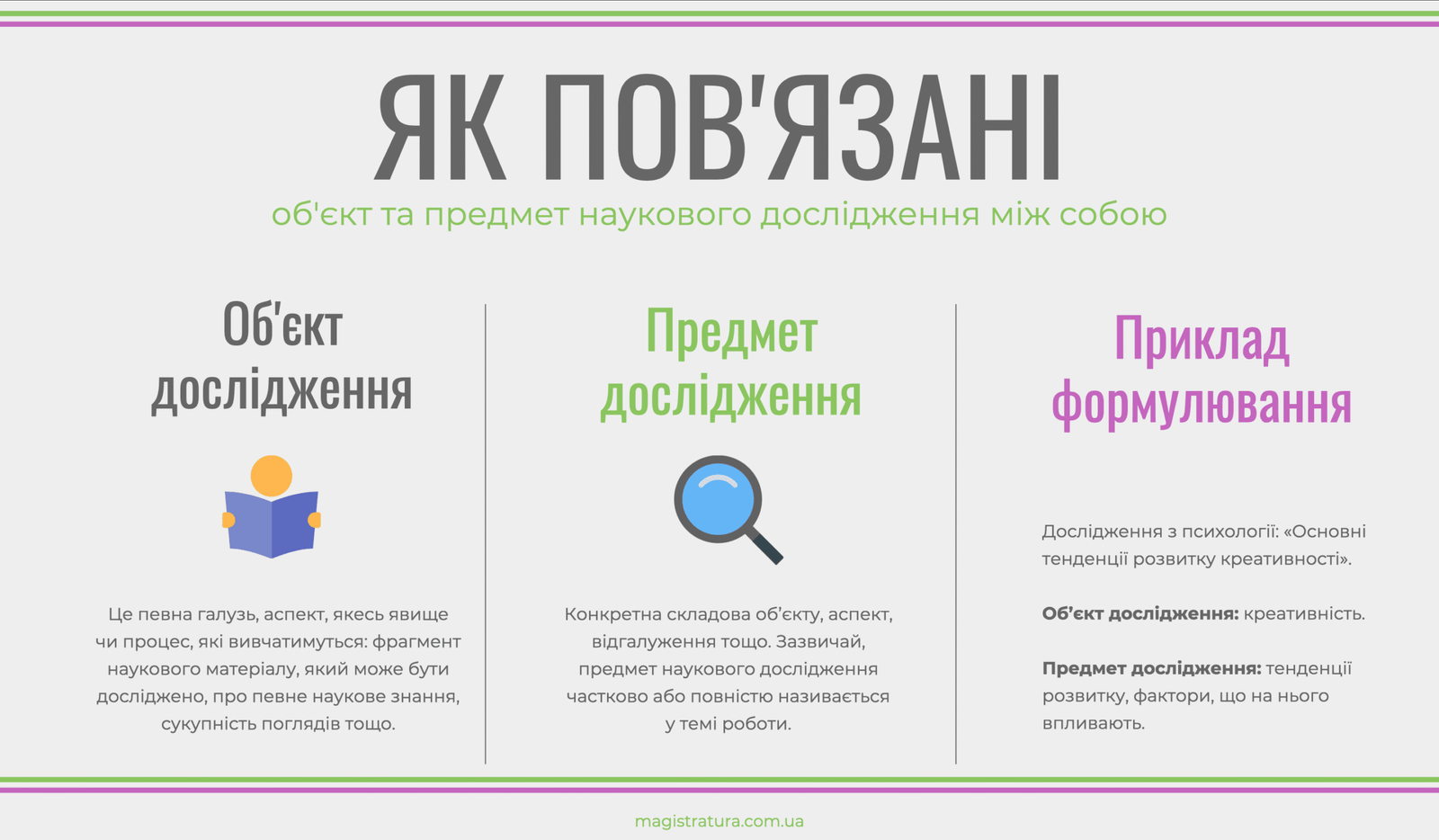 - Визначення меж дослідження: Чітке визначення об’єкта допомагає визначити межі того, що саме буде досліджуватися, запобігаючи перетворенню дослідження у занадто широке або розпливчасте.
