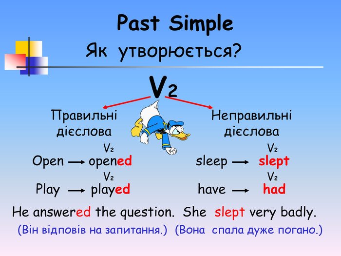 - Стверджувальні Речення: Утворюються за допомогою другої форми дієслова (для правильних дієслів додаємо закінчення -ed, для неправильних — друга форма). Наприклад: “I walked to the store.”