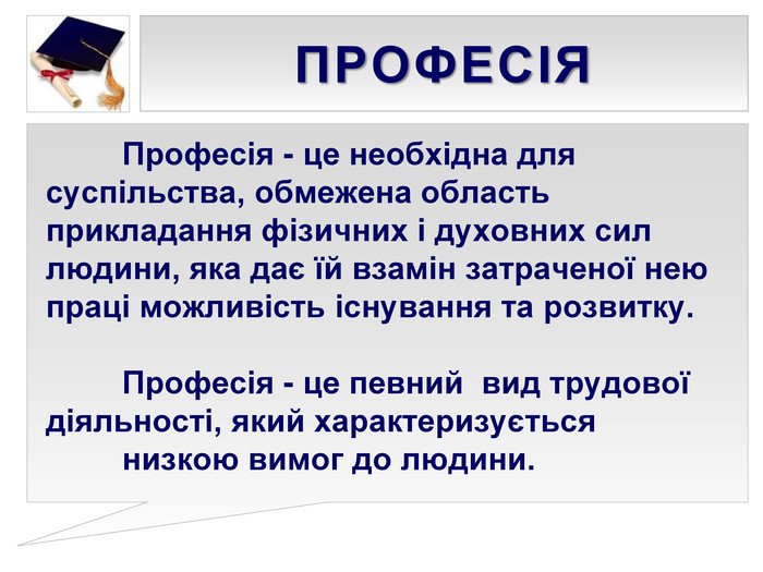 Професія – це вид трудової діяльності, що вимагає певних знань, умінь та навичок, здобутих у результаті навчання та практичного досвіду. Це систематична діяльність, яка забезпечує людині матеріальні засоби для життя і може задовольняти її особисті інтереси.