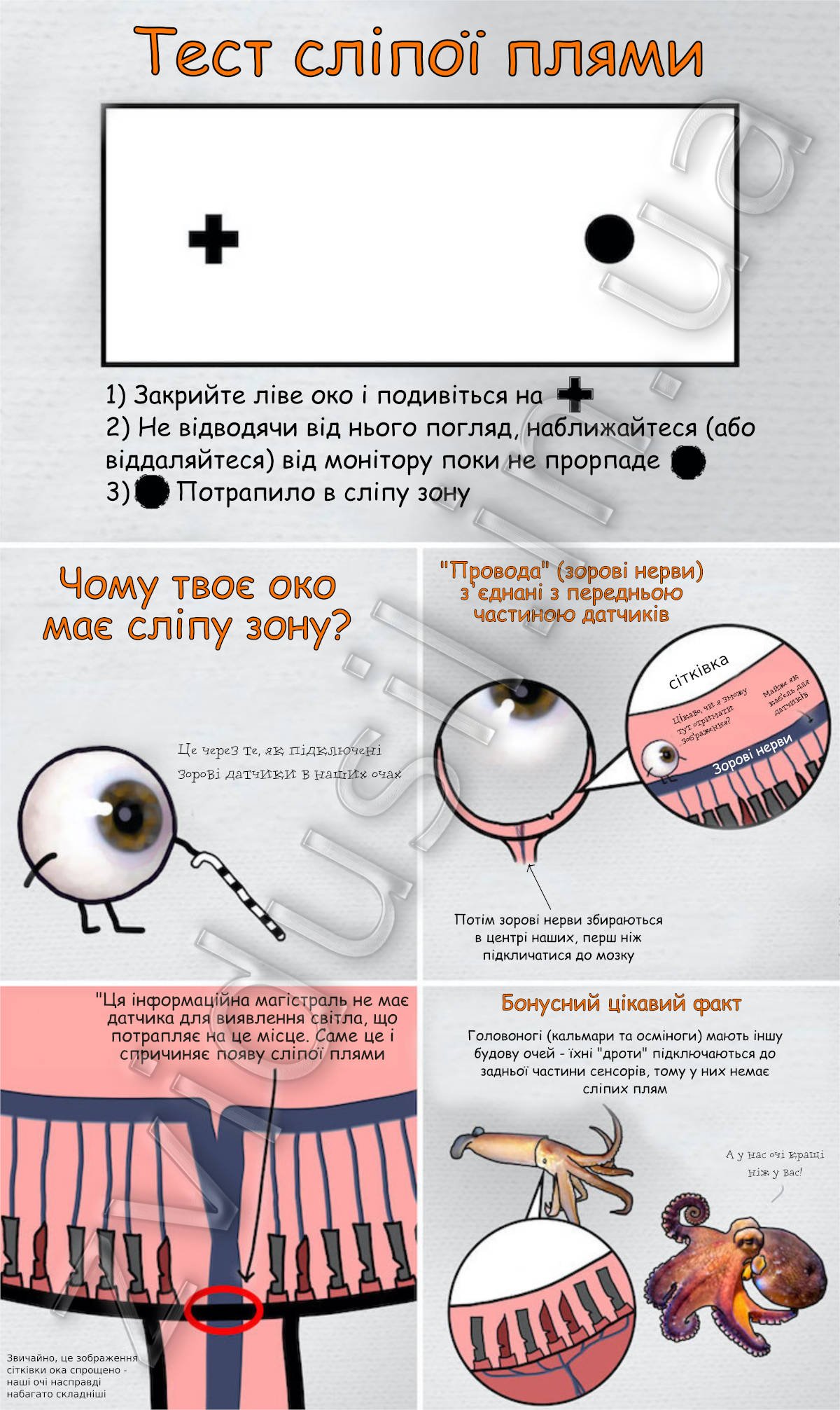 Сліпа пляма — це невелика частина сітківки, де нервові волокна з ока з’єднуються з зоровим нервом і виходять з ока до мозку. У цій частині сітківки відсутні фоторецептори, які відповідають за сприйняття світла, тому ми не бачимо зображення. Але чому це так важливо?