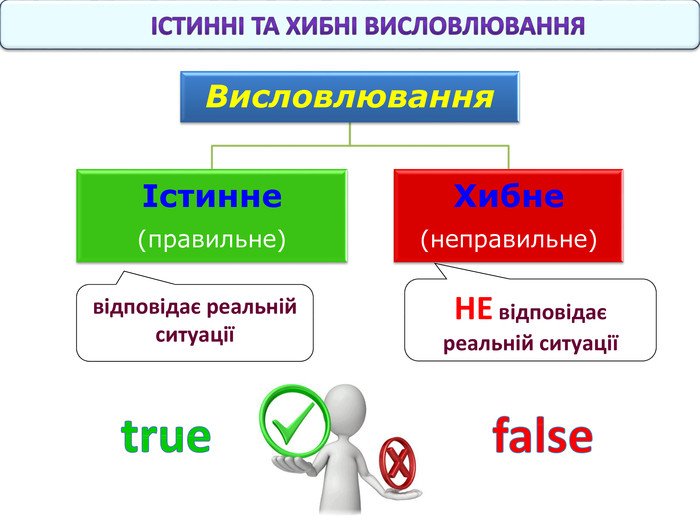 - Істинність і хибність: Висловлювання може мати певне значення істини в контексті логічного висновку.