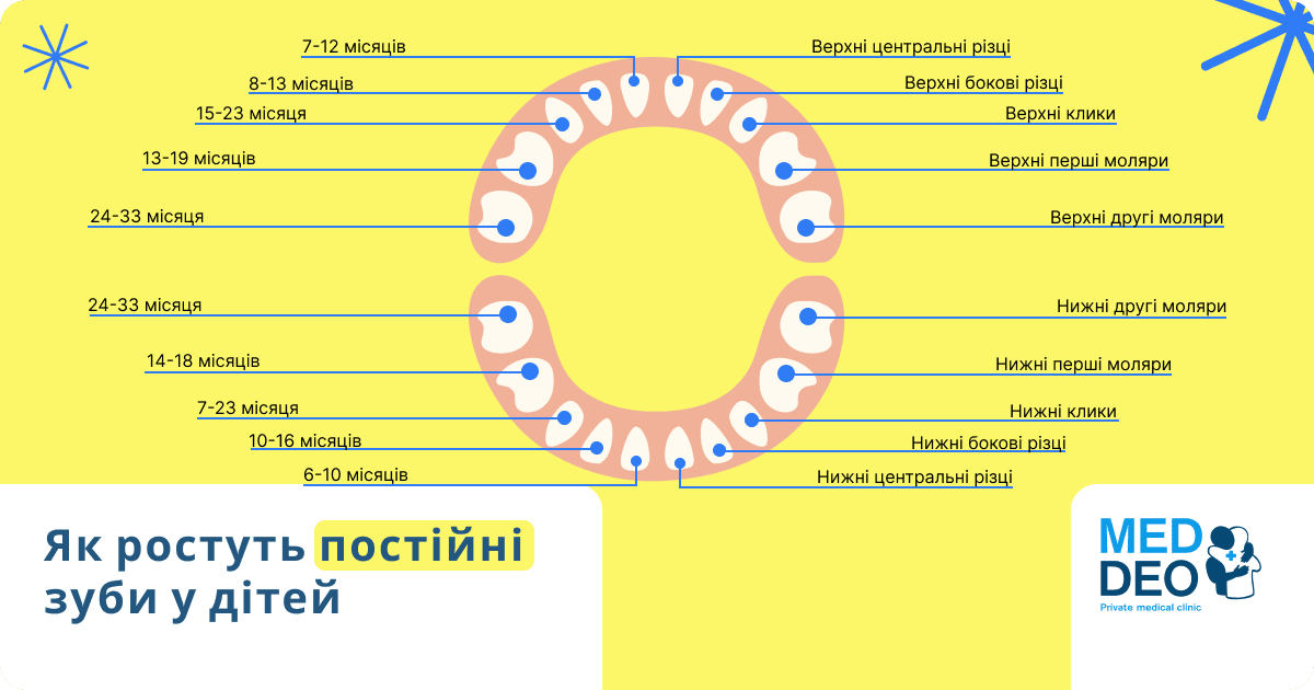 - 9-13 місяців: різці, сусідні з центральними, починають рости.