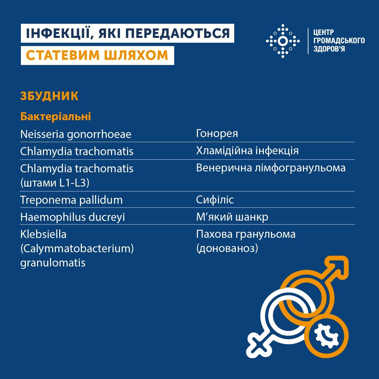 | Гонорея | Neisseria gonorrhoeae | Виділення з уретри у чоловіків, біль під час сечовипускання, виділення з піхви у жінок |