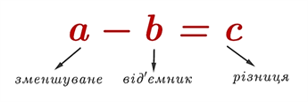 | a – b = c | a – зменшуване, b – від’ємник, c – різниця |
