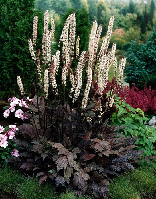 - Особливо популярний вид — цимицифуга ветвиста, або атропурпурея, славиться своїм пурпуровим забарвленням листя.