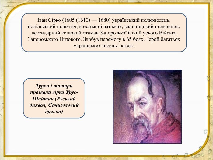 - Іван Сірко — легендарний козацький отаман, котрий понад 50 разів обирався кошовим; знаний сміливими походами на турків і татар.