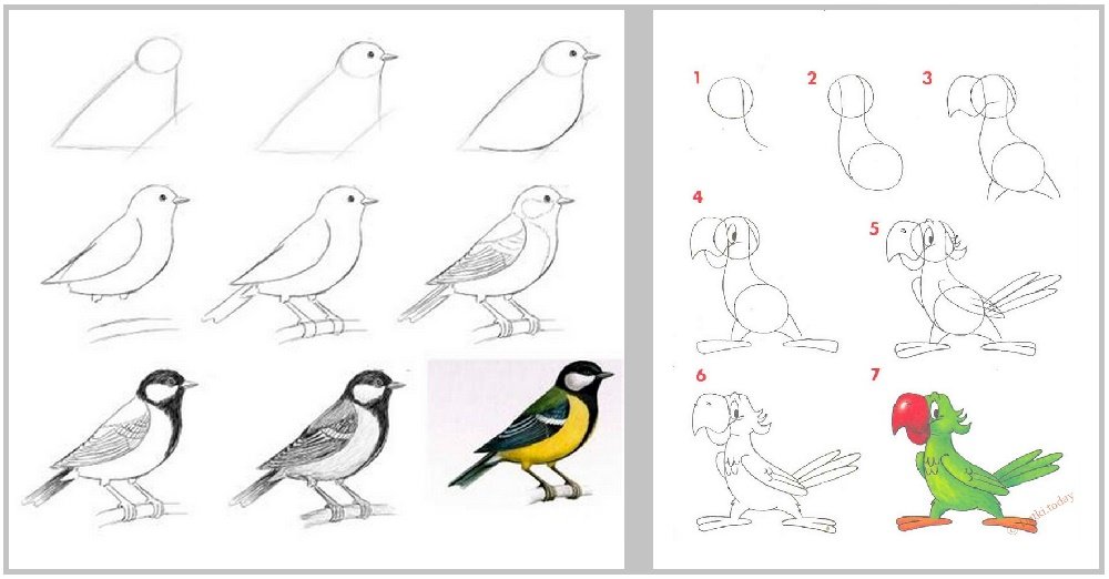 - Голова та дзьоб: Визначте розміри голови відносно тіла. Нарисуйте невелике коло для голови і трикутник для дзьоба.