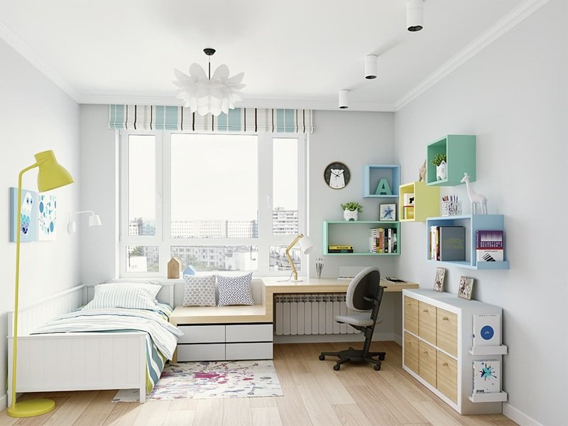 Добре працюють природні тони, м’які текстури, нейтральні кольори меблів. Стелажі та ящики допомагають приховати зайві речі, а крісло й стіл – сформувати правильні звички роботи за робочим місцем.