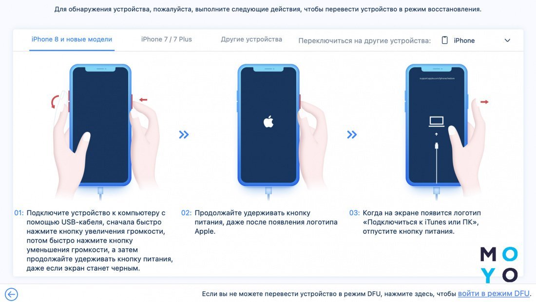- Для iPhone 8 і новіших: натисніть та відпустіть кнопку збільшення гучності, потім кнопку зменшення, далі утримуйте бічну кнопку, поки не з’явиться режим відновлення.