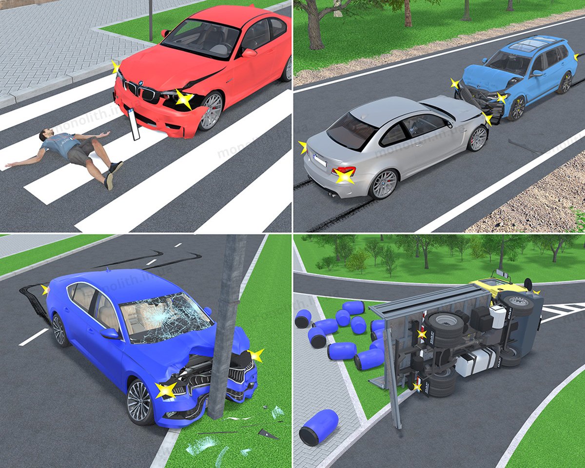 - Шкода майну (автомобіль, дорожня інфраструктура).