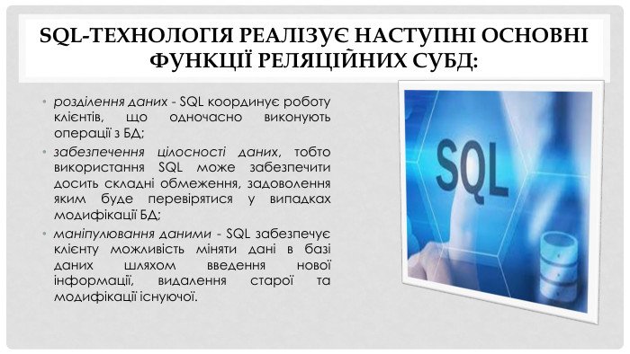 - Маніпуляція даними: дозволяє виконувати запити та аналіз даних для отримання потрібної інформації.