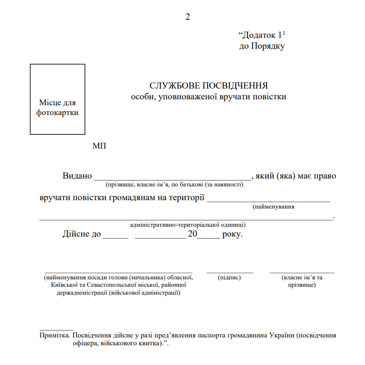 - Документ є необхідним під час виконання службових завдань за межами ТЦК, слугуючи підтвердженням повноважень його власника.