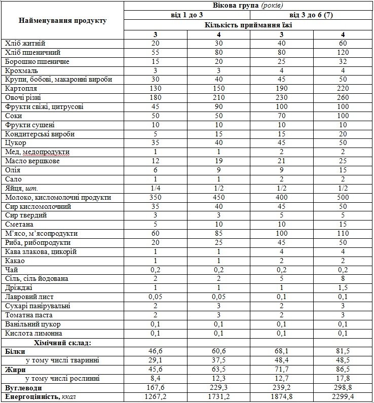 | Вік (роки) | Енергія (ккал) | Білки (г) | Жири (г) | Вуглеводи (г) |