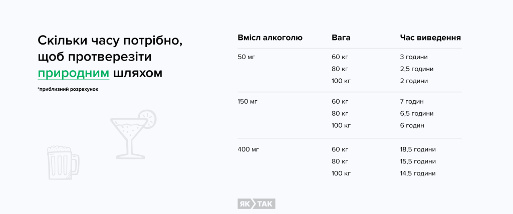 - Спожита кількість алкоголю: Зрозуміло, що більша кількість алкоголю потребує більше часу для виведення.