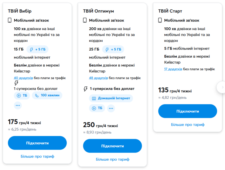 | Твій Старт | Мінімальний пакет послуг, орієнтований на базові потреби в мобільному зв’язку. | 75 грн |