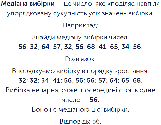 - Парна кількість елементів: Якщо кількість елементів n парна, медіаною буде середнє арифметичне двох центральних елементів. Наприклад, у вибірці [3, 5, 7, 9], медіаною буде середнє арифметичне 5 і 7, тобто (5+7)/2 = 6.