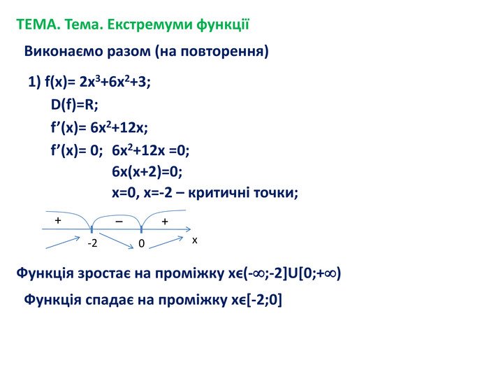 - Обчислити похідну f'(x) = 3x^2 – 6x.