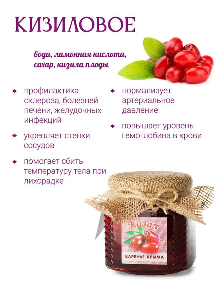 - Багатий склад вітамінів: В кизиловому варенні міститься велика кількість вітаміну C, який зміцнює імунну систему та сприяє швидшому одужанню при застудах.