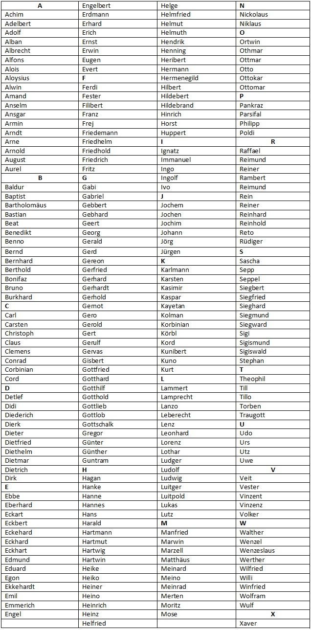 Чоловічі імена у Німеччині часто пов’язані з давньонімецькими словами, які мають конкретні значення, такі як “сила”, “сміливість”, “благородство” та інші позитивні якості. Багато з них походять від імен святих чи фігур з германо-скандинавської міфології.