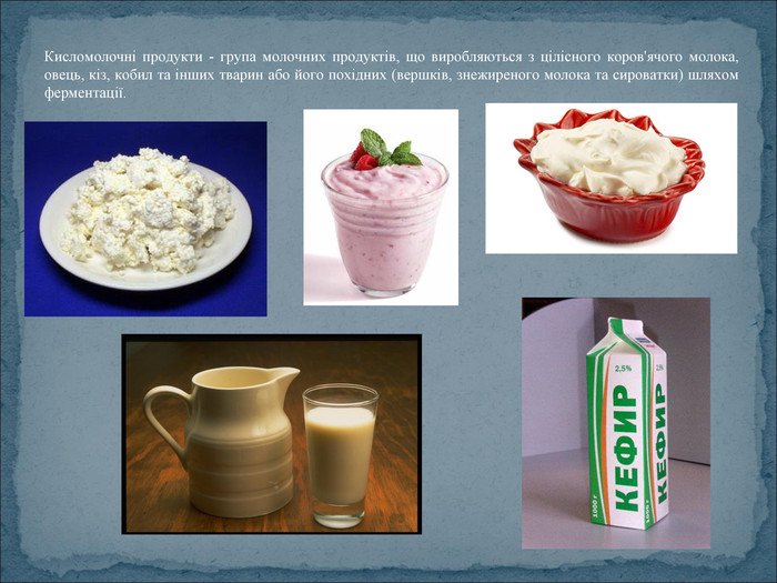 - Йогурт – один з найпопулярніших кисломолочних продуктів, отриманий шляхом ферментації молока спеціальними бактеріями. Йогурт може бути натуральним або з добавками у вигляді фруктів або меду.